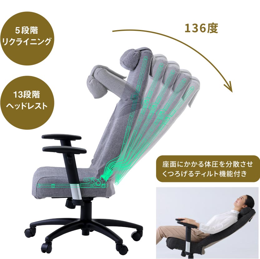 136度まで調整可能な5段階リクライニングと13段階のヘッドレスト