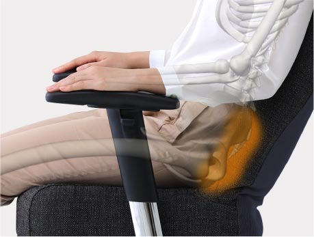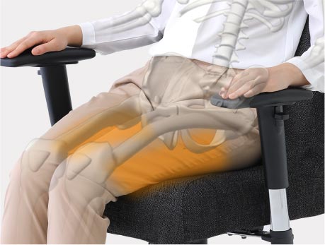 お尻を広い面で支え、一箇所に圧がかかることを防ぎます。動きを妨げないゆったりとした幅で、快適に長時間座り続けることができます。