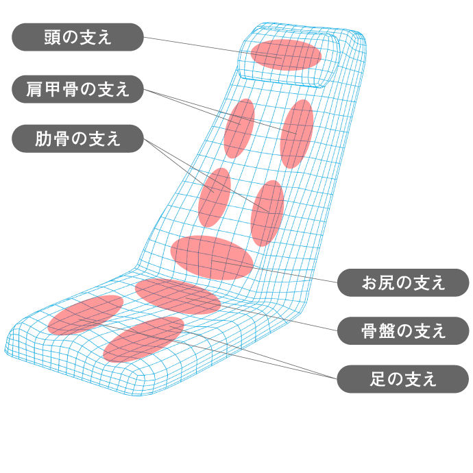三次元立体構造システム「エスリーム技術」を応用した背座一体型シート「p!nto」に備わっている、支持面の情報