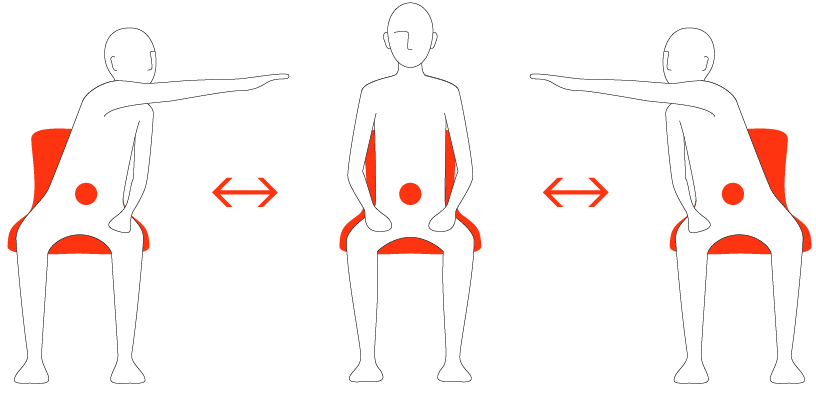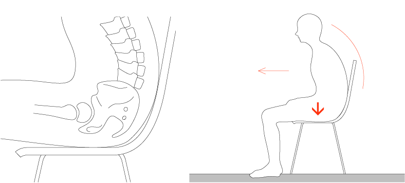 座位で機能的な活動を可能にするバランスを保つためには、骨盤の下部にある坐骨で身体を支える必要がありますが、小さく丸い形状の坐骨は平面の椅子の上でその位置を保つことができず、骨盤ごと後ろに倒れてしまいます。また、目・口・鼻・頭など行動に関わるパーツは身体の前面にあり、手の操作も身体の前で行われるのに対して、身体を支えるべき背骨は背部に位置しています。だから、重心を後ろに残そうとする身体の反応が骨盤の後方への傾きや押しつけにつながり、丸く緊張した背中の状態をつくってしまいます。そして倒れようとする骨と、とどまろうとする筋肉。この葛藤の中で行われる日常的な動作がストレスとなり、コリ・痛み・歪み・緊張といった身体の不調を引き起こしているのです。
