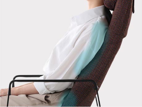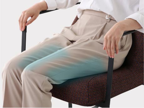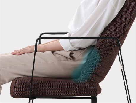 お尻を広い面で支え、一箇所に圧がかかることを防ぎます。動きを妨げないゆったりとした幅で、快適に長時間座り続けることができます。